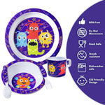 - BENTOLOGY MONSTER MEALTIME KIT: Kids plates feeding set includes a plate, bowl, cup, fork and spoon. Dimensions: Round plate is 8.5 inches wide, bowl is 6.5 inches, cup is 3 inches wide on the mouth piece, and fork/spoon are 5.25 inches in length.