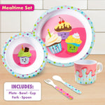 - BENTOLOGY CUPCAKE MEALTIME KIT: Kids plates feeding set includes a plate, bowl, cup, fork and spoon. Dimensions: Round plate is 8.5 inches wide, bowl is 6.5 inches, cup is 3 inches wide on the mouth piece, and fork/spoon are 5.25 inches in length.